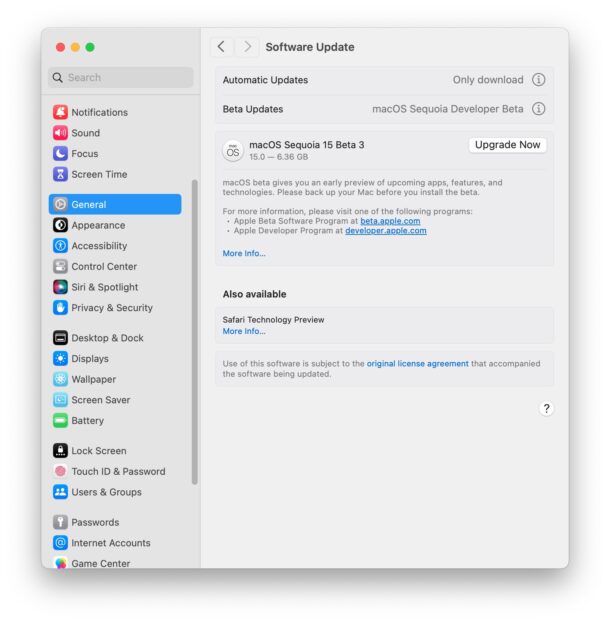 - اختر "التحديث الآن" للنسخة التجريبية الثالثة من مطور MacOS Sequoia 15