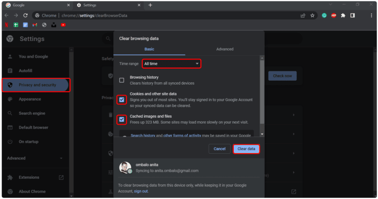 ليس سرا ذلكملفات تعريف الارتباط والبيانات المخزنة مؤقتًايمكن أن يبطئ تجربة التصفح لديك. يمكن أن يساعد أيضًا مسح ذاكرة التخزين المؤقت وملفات تعريف الارتباط في المتصفحإصلاح مشكلات NordVPN وOmegle.