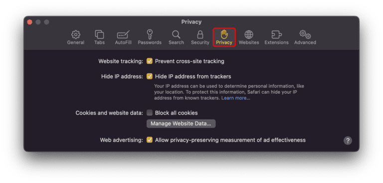 - في الزاوية العلوية اليسرى من النافذة الجديدة، انقر فوق "خصوصيةعلامة التبويب ". ضمن "ملفات تعريف الارتباط وبيانات الموقع"القسم، انقر فوق"إدارة بيانات الموقع.”
