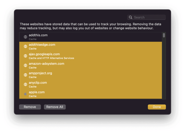 - في النافذة المنبثقة، حدد كافة مواقع الويب التي تريد حذف ملفات تعريف الارتباط الخاصة بها.