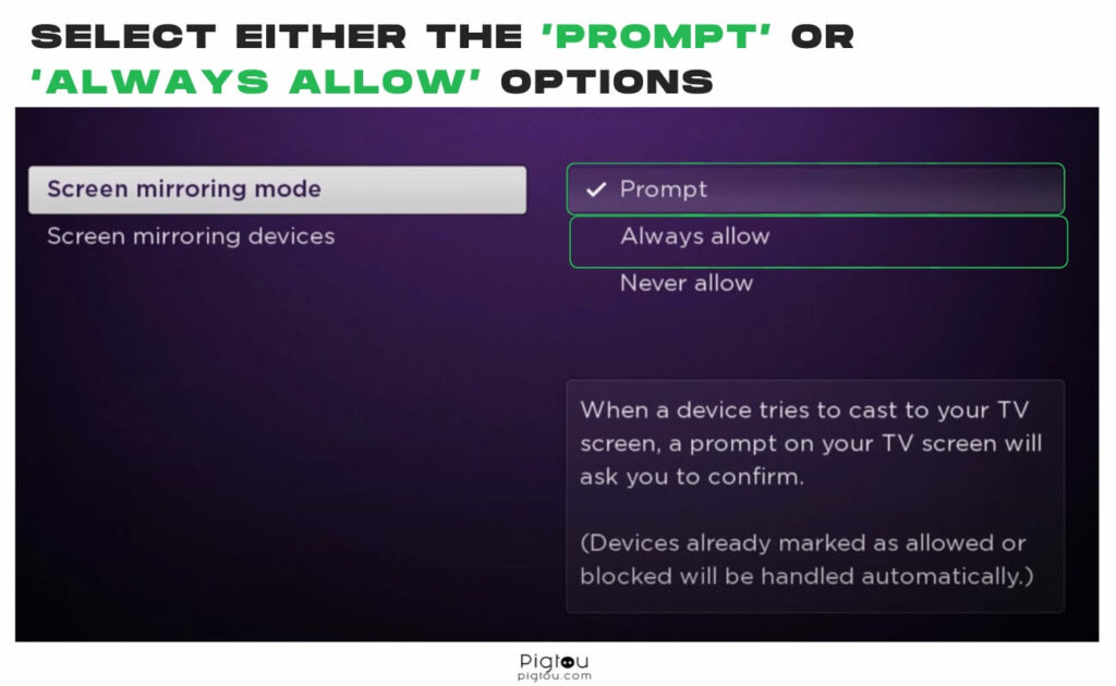 حدد خيار "مطالبة" أو "السماح دائمًا" في وضع انعكاس الشاشة / الصورة: Pigtou.com8. قم بتشغيل وظيفة البدء السريع