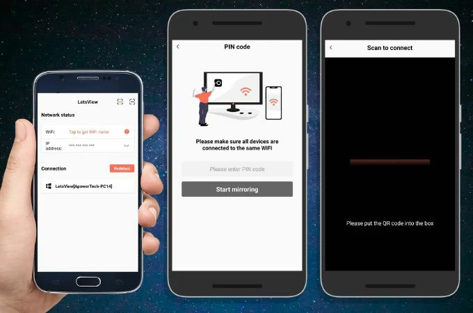 - بعد ذلك، يمكنك توصيل هاتفك بالتلفزيون الخاص بك بطريقتين. استخدم رمز الشرطة em أو رمز النجمة لمسح رمز الرقم أو إدخاله يدويًا. يتم عرض رمز PIN ورمز QR تلقائيًا على جهاز التلفزيون الخاص بك.