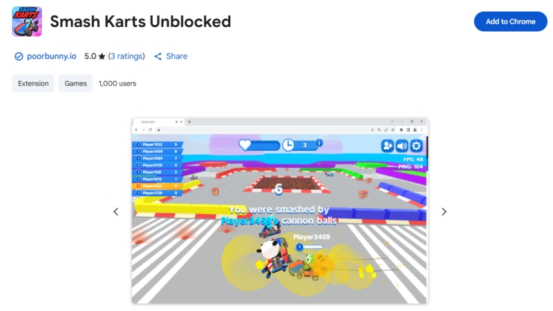 يمكن لبعض ملحقات Smash Karts غير المحظورة أن تتيح لك ممارسة اللعبة في المدرسة أو في أي مكان عندما لا تتمكن من الوصول إلى Smash Karts من خلف جدران الحماية الخاصة بالمدرسة أو المكتب. بعض ملحقات Smash Karts غير المحظورة مثلسحق عربات غير محظورةمتاحة لمتصفحي Chrome وFirefox.
