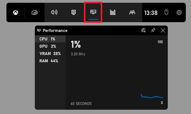 إذا كنت تفضل فقط رؤية استخدام وحدة معالجة الرسومات (GPU) ووحدة المعالجة المركزية (CPU)، فيُقترح استخدام أداة Windows Game Bar Performance. في هذه النافذة، يمكنك معاينة الاستخدام الحالي للمعالج (CPU) وبطاقة الرسومات (GPU)، بالإضافة إلى مقدار ذاكرة الوصول العشوائي (RAM) وVRAM المستخدمة في هذه اللحظة. يمكن أن يساعدك هذا في تحديد ما إذا كانت اللعبة التي تقوم بتشغيلها تتطلب الكثير من الجهد وتسبب مشكلات تتعلق بأداء نظامك.