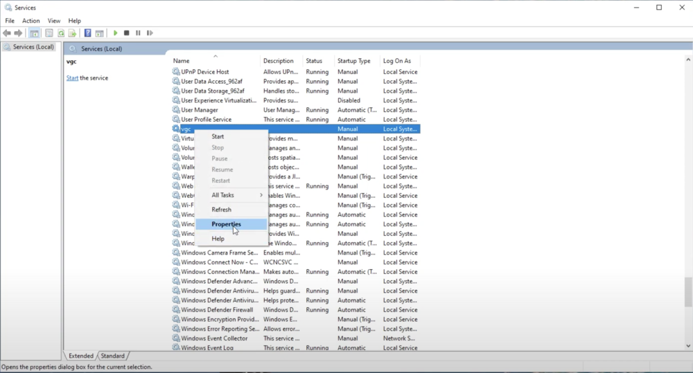 في المربع، اكتب "services.msc" ثم اضغط على "إدخال" لفتح مدير التحكم في الخدمة. بعد ذلك، ابحث عن خدمة “VGC” وانقر عليها بزر الماوس الأيمن. من القائمة، حدد "خصائص". في علامة التبويب "عام" في نافذة "الخصائص"، قم بتعيين نوع بدء التشغيل على "تلقائي" وقم بتطبيق التغييرات. وأخيرًا، ابدأ الخدمة إذا تم ضبطها على التوقف.