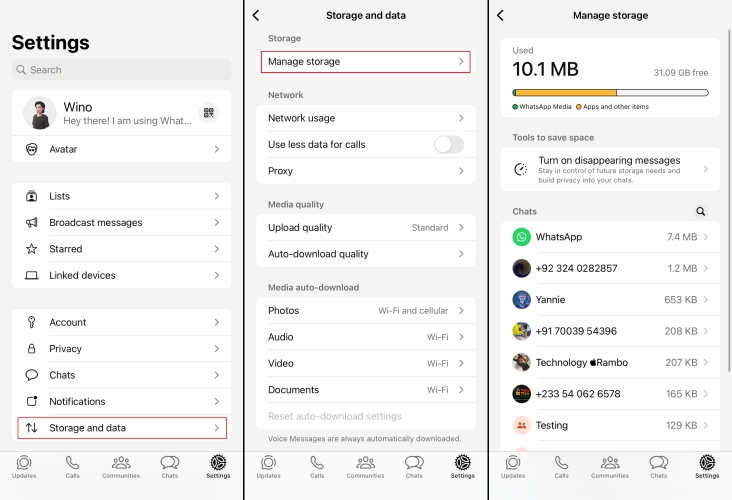 الخطوة 2.مقبضإدارة التخزينللتحقق من استخدام ذاكرة التخزين المؤقت لتطبيق WhatsApp.