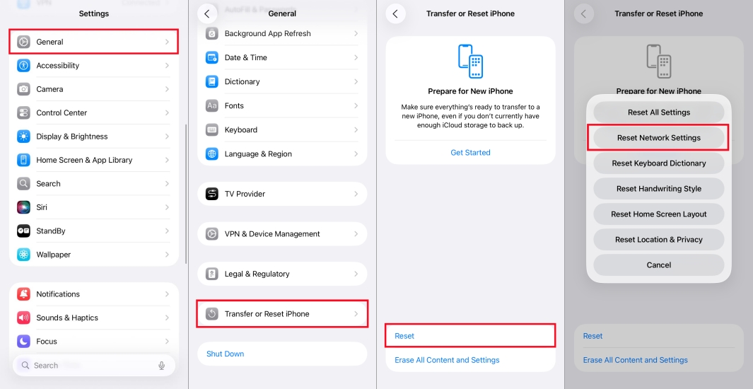 الخطوة 3.مقبضإعادة تعيين> إعادة ضبط إعدادات الشبكةثم أدخل رمز المرور الخاص بك لإعادة توجيه الإجراء.