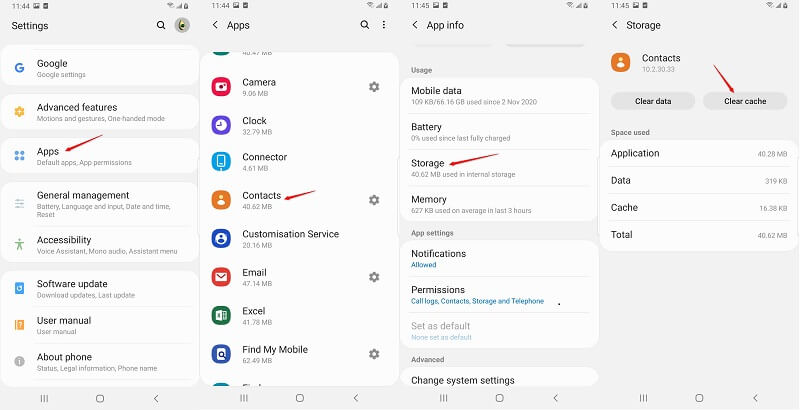 مسح ذاكرة التخزين المؤقت لتطبيق جهات الاتصال