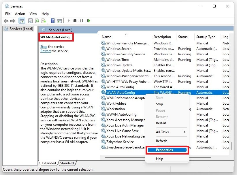 انقر على أي خدمة وابدأ في الكتابةالتكوين التلقائي لشبكة WLAN. انقر بزر الماوس الأيمن فوق الخدمة وانتقل إلى خصائصها.