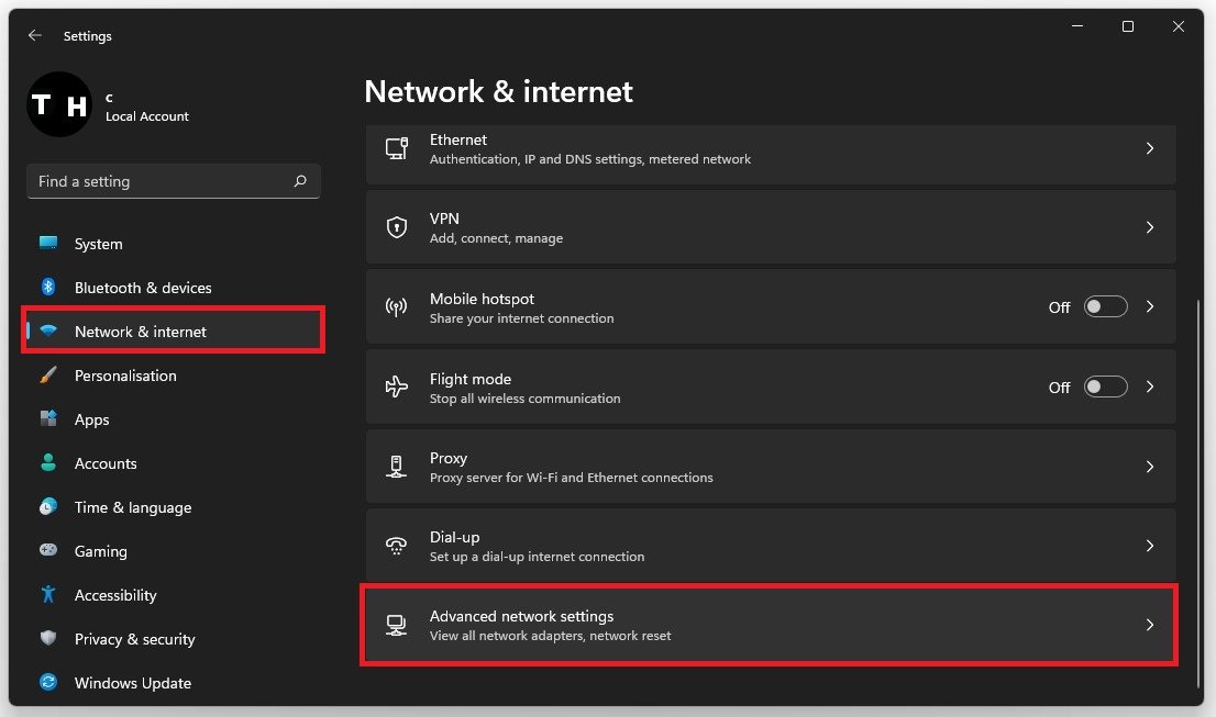 إعدادات Windows > الشبكة والإنترنت > إعدادات الشبكة المتقدمة