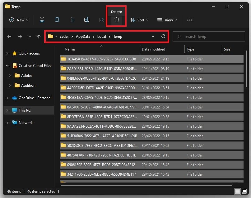 احذف ملفاتك المؤقتة بالبحث عن٪درجة حرارة٪وضرب أدخل. سيتم فتح مستكشف الملفات الخاص بك. يمكنك حذف كل شيء في هذا المجلد بأمان، وقد تبقى بعض الملفات، لذا اتركها هناك. بعد الحذف، يمكنك إفراغ سلة المحذوفات لإزالة الملفات وإنشاء مساحة تخزين لتحديث نظام التشغيل الخاص بك.