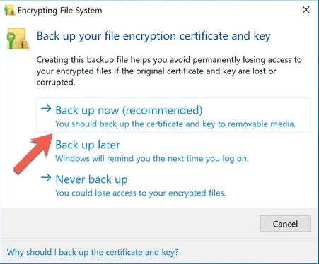 3. Vložte USB disk, abyste bezpečně uložili šifrovací certifikát EFS.