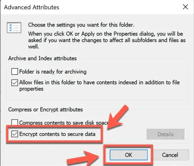 Krok 3. V okně Pokročilé atributy zaškrtněte „Zašifrovat obsah pro zabezpečení dat“ a poté klikněte na „OK“.