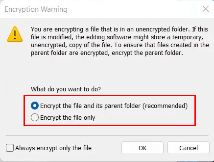 Krok 5. Když se objeví upozornění na šifrování, vyberte „Zašifrovat soubor a jeho nadřazenou složku (doporučeno)“ nebo „Zašifrovat pouze soubor“ a klikněte na „OK“.