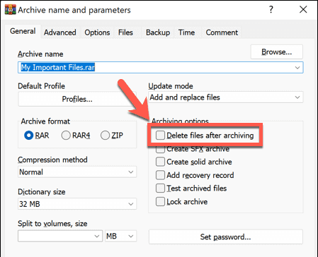 Krok 3. Ujistěte se, že je vybrána možnost „Smazat soubory po archivaci“. To zabraňuje duplicitním složkám a udržuje tak chráněnou archivní složku.