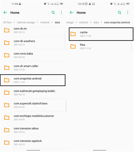 Krok 2. Zde najdete uložená data pro všechny vaše aplikace. Vaším úkolem je posunout se dolů a vyhledat složku s názvem „com.snapchat.android“ a otevřít ji. Pokud jsou smazané zprávy Snapchat stále uloženy, uvidíte složku „Cache“.