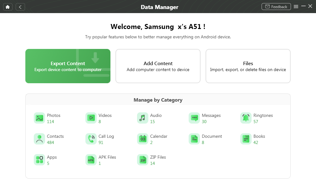 Krok 3 Vyberte režim Export obsahu a otevřete rozhraní zobrazující konkrétní data na vašem zařízení Samsung. Nyní můžete zobrazit náhled a selektivnězálohování telefonu Samsung do počítače.