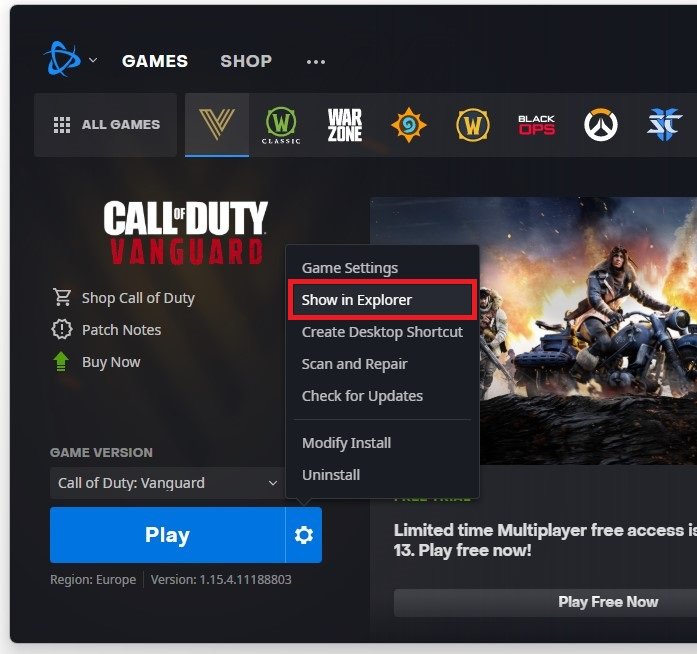 Po provedení těchto změn v operačním systému byste měli před opětovným spuštěním CoD Vanguard restartovat počítač. Nakonec znovu otevřete svůj Battle.net launcher a v nastavení Call of Duty: Vanguard vyberteZobrazit v Průzkumníku.