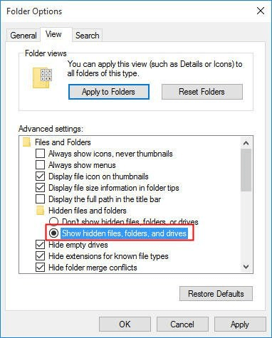 Krok 1: Otevřete „Ovládací panely“ > „Možnosti Průzkumníka souborů“ > Klikněte na kartu „Zobrazit“ > Zaškrtněte políčko vedle „Zobrazit skryté soubory, složky a jednotky“.
