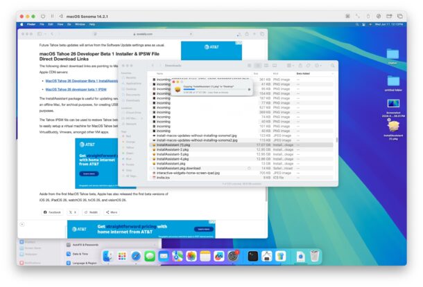 Na tomto příkladu snímku obrazovky je zkopírován úplný instalační balíček pro MacOS Tahoe z místního hostitelského Macu do virtuálního stroje MacOS Sonoma, takže virtuální stroj lze snadno upgradovat na MacOS Tahoe. Virtualizace MacOS představuje skvělý způsob, jak testovat nové operační systémy v kontrolovaném prostředí, aniž byste museli své stabilní vydání MacOS nahrazovat chybnou beta verzí.