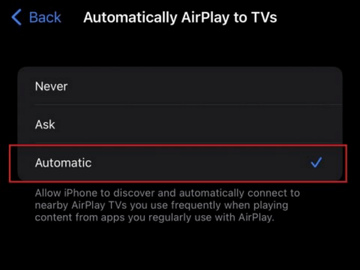 Krok 3Klikněte na „Automaticky AirPlay to TVs“ a poté vyberte „Automaticky“.