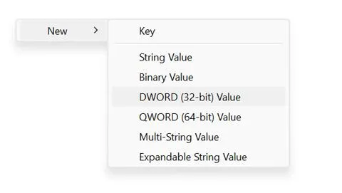 - Vyberte Nový > Hodnota DWORD (32bitová).