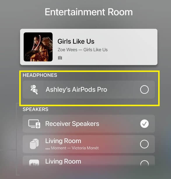 4. Vyberte svůjAirPodsze seznamu dostupných zařízení a použijte je jakoaudio výstup.