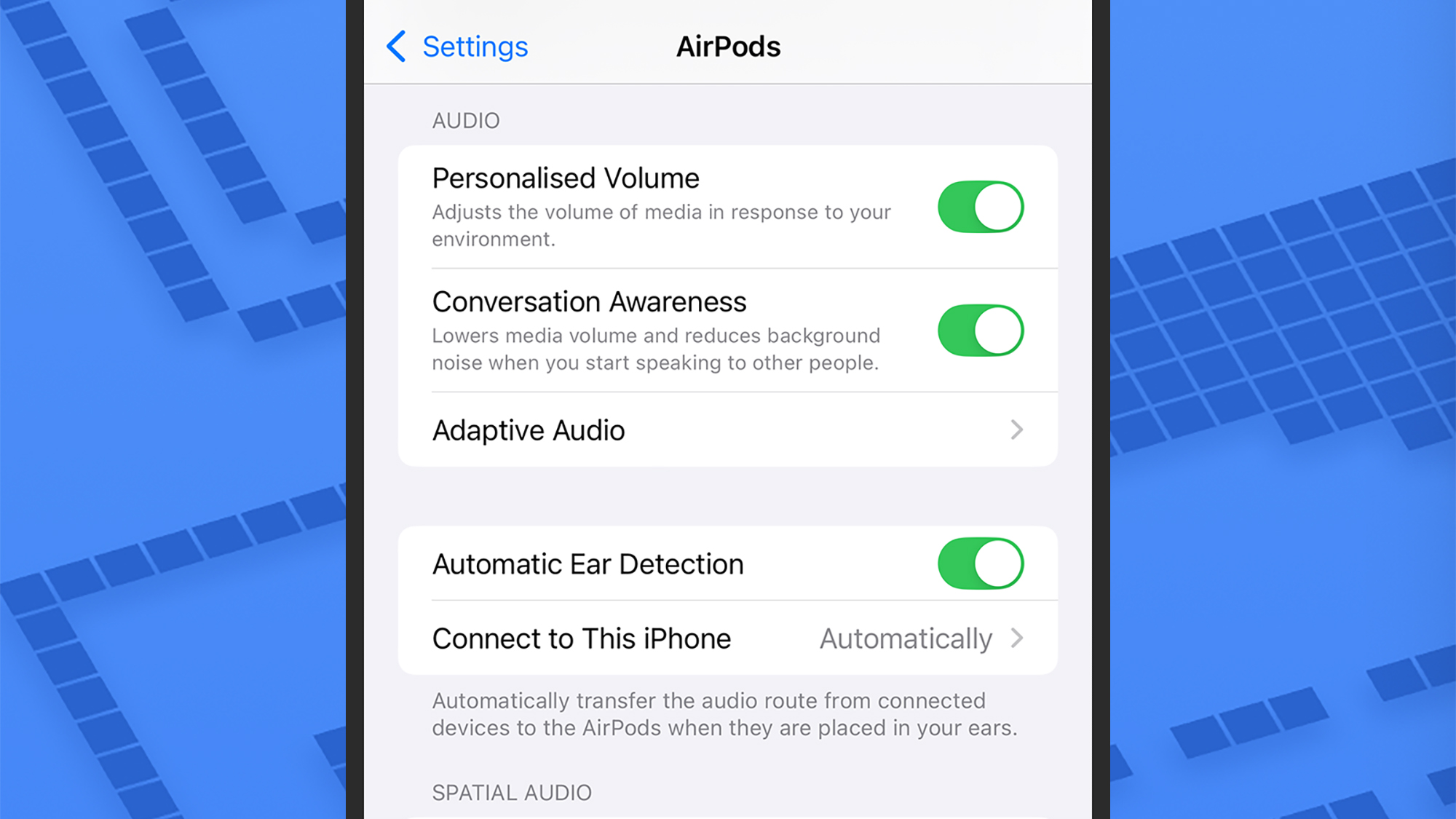 Nejnovější modely AirPods obsahují funkci zvanou Adaptive Audio, což znamená, že dokážou automaticky upravit úrovně potlačení hluku podle toho, co je kolem vás: Pokud tedy sluchátka detekují, že se například pokoušíte s někým mluvit, bude dovnitř propuštěn více vnějšího hluku. Klepněte naAdaptivní zvukpro nastavení citlivosti detekce hlasitosti.