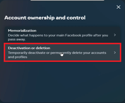 Při postupu na další stránku si všimnete dvou odlišných možností: „Uložení do paměti“ a „Deaktivace nebo smazání“. Vyberte možnost „Deaktivace nebo smazání“, čímž budete o krok blíže k trvalému odstranění účtu. Pokud máte více než jeden účet na Facebooku, nyní je čas vybrat ten, který chcete smazat.