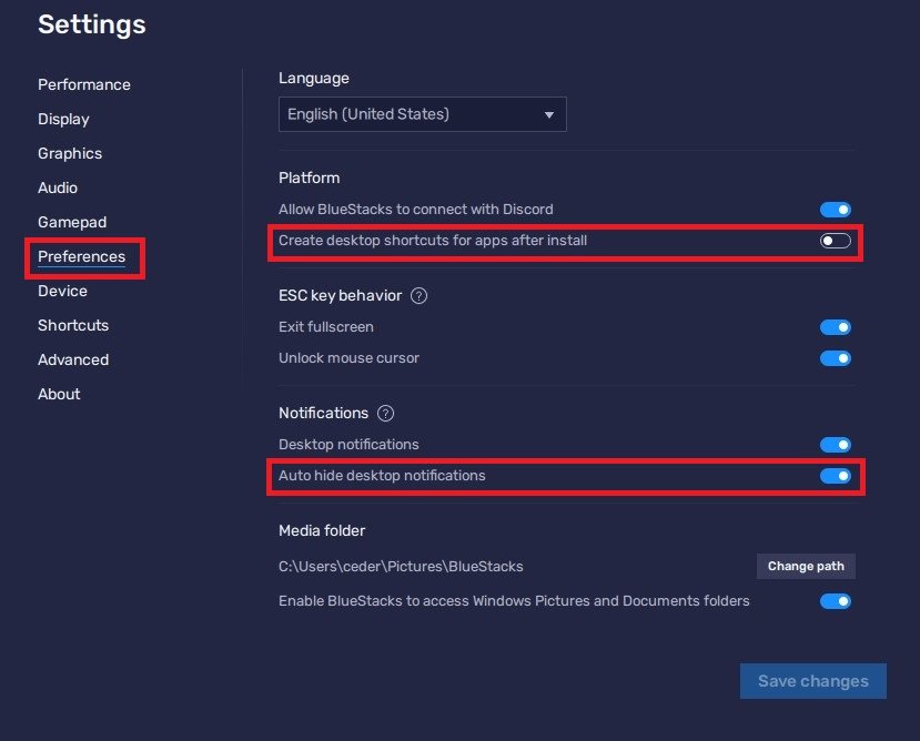 Po uložení změn přejděte do svéhoPředvolbytab. Rádi deaktivujemePo instalaci vytvořte na ploše zástupce aplikacímožnost a povolteAutomaticky skrýt oznámení na plošemožnost ve hře. Doporučujeme podívat se na další nastavení, ale prozatím byste měli být v pořádku, když budete hrát Free Fire poprvé.
