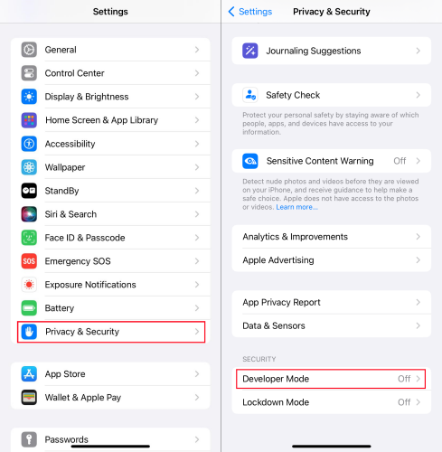 Krok 2Vydejte seNastavení > Soukromí a zabezpečení > Režim pro vývojáře.