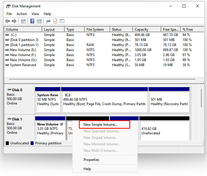Vytváření oddílů pomocí správy disků vyžaduje nepřidělené místo na disku. Pokud nepřidělené místo není k dispozici, můžete nejprve zmenšit primární oddíl, abyste přidělili další místo, a poté z vygenerovaného prostoru vytvořit nový primární oddíl. Konkrétní kroky jsou následující: