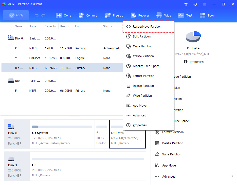 Krok 1. Nainstalujte a spusťte IEMOA Partition Assistant. Klikněte pravým tlačítkem na cílový oddíl (například D:) v hlavní konzole a vyberte „Změnit velikost/přesunout oddíl“.