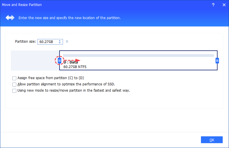Krok 2. Změňte velikost oddílu a přetáhněte okraj oddílu doleva nebo doprava, aby se oddíl zmenšil. Kliknutím na „OK“ vygenerujete nepřidělené místo.