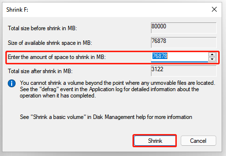 Krok 3. Zadejte požadované množství prostoru pro zmenšení do poskytnutého pole a klikněte na „Shrink“. Tato operace vygeneruje potřebné nepřidělené místo.