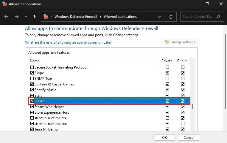 Otevře se nové okno. Klikněte naZměnit nastavenía najděte aplikaci, jako je Steam, která způsobuje chybu DirectX například při instalaci her. Před kliknutím na aplikaci nezapomeňte zaškrtnout obě tato políčkaOK.