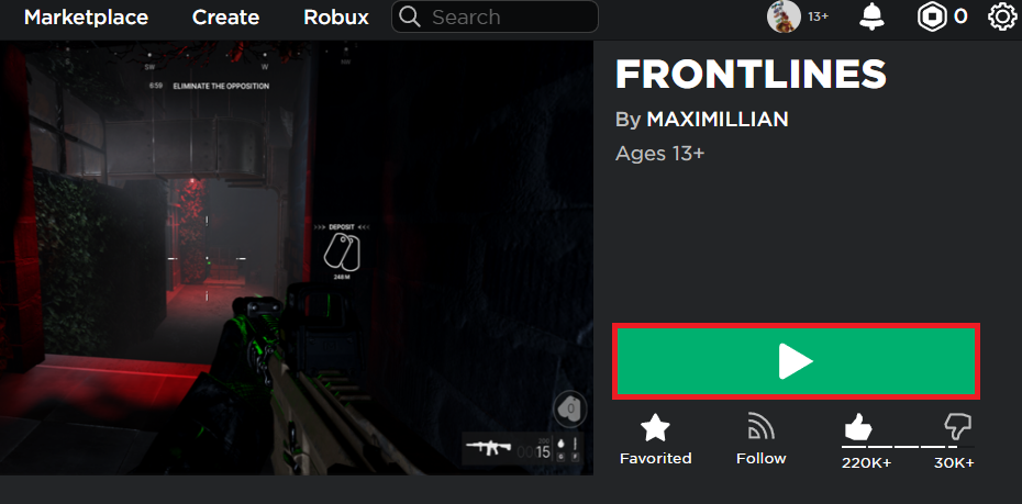 Je čas zahájit obnovu smazaných souborů kritických pro fungování Robloxu. Chcete-li toho dosáhnout, navštivte Roblox.com a vyberte jakoukoli hru nebo zážitek, který chcete hrát. Tato akce automaticky spustí web Roblox ke spuštění hry a následně znovu nainstaluje soubory, které jsme dříve vymýtili.