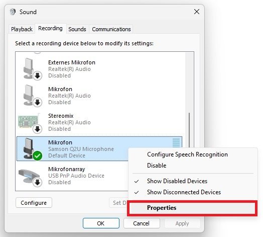 Klepněte pravým tlačítkem myši na mikrofon, který chcete použít, a přejděte na jeho vlastnosti.