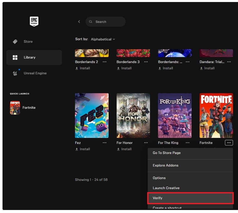 Jako poslední možnost ověřte integritu svých herních souborů Fortnite. Ve vašemepické hrylauncher, přejděte do knihovny her. Klikněte na nabídku burgerů pro Fortnite a vyberteOvěřte. Opětovné stažení a nahrazení chybějících nebo poškozených herních souborů bude trvat několik minut.