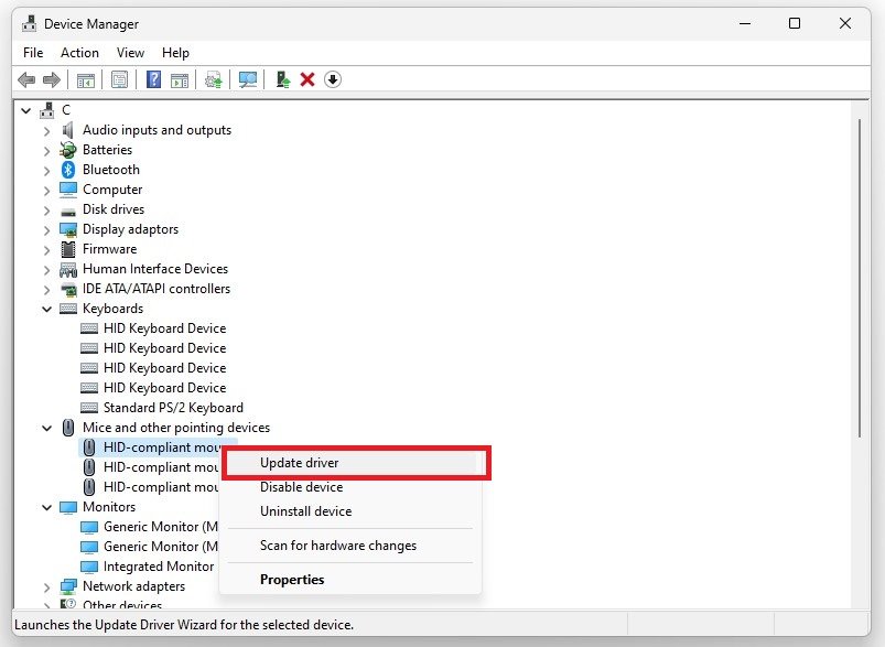 Rozšiřte svéKlávesnice,Myši a další ukazovací zařízeníaMonitory. Pro každé zařízení klikněte pravým tlačítkem na správné zařízení a vyberteAktualizujte ovladač. Nakonec klikněte naAutomaticky vyhledávat ovladače, což chvíli potrvá, než se přesvědčíte, že je ovladač vašeho zařízení aktuální.