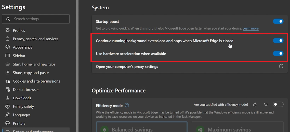 Vypněte možnost – „Pokračovat v běhu rozšíření a aplikací na pozadí, když je Microsoft Edge zavřený“. Tento krok se zaměřuje na uvolnění zdrojů a zajištění plynulejšího procházení.