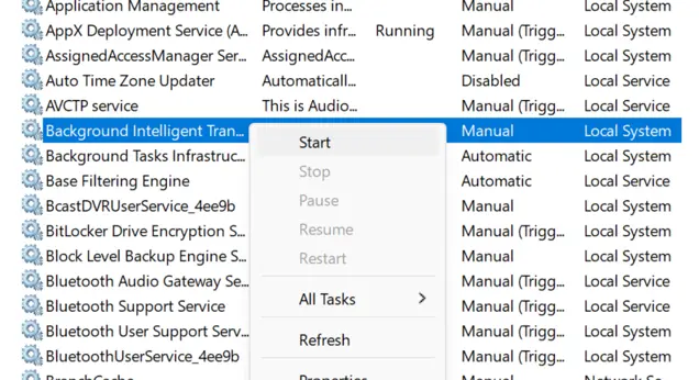 3. Pokud jsou některé zastaveny → Klepněte pravým tlačítkem myši → Start.