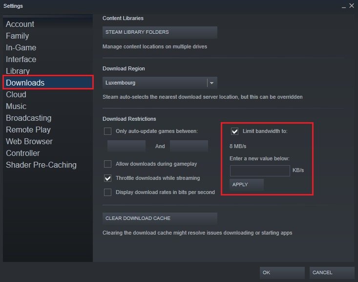 Chcete-li tomu zabránit, otevřete příslušnou aplikaci, v tomto příkladu „Steam“. Přejděte do nastavení aplikace. VStahováníomezte šířku pásma stahování na přibližně třetinu rychlosti stahování. To se také sníží na rychlosti zápisu úložiště vašeho počítače. Použijte limit šířky pásma, který je v tomto případě 8 MB/s.