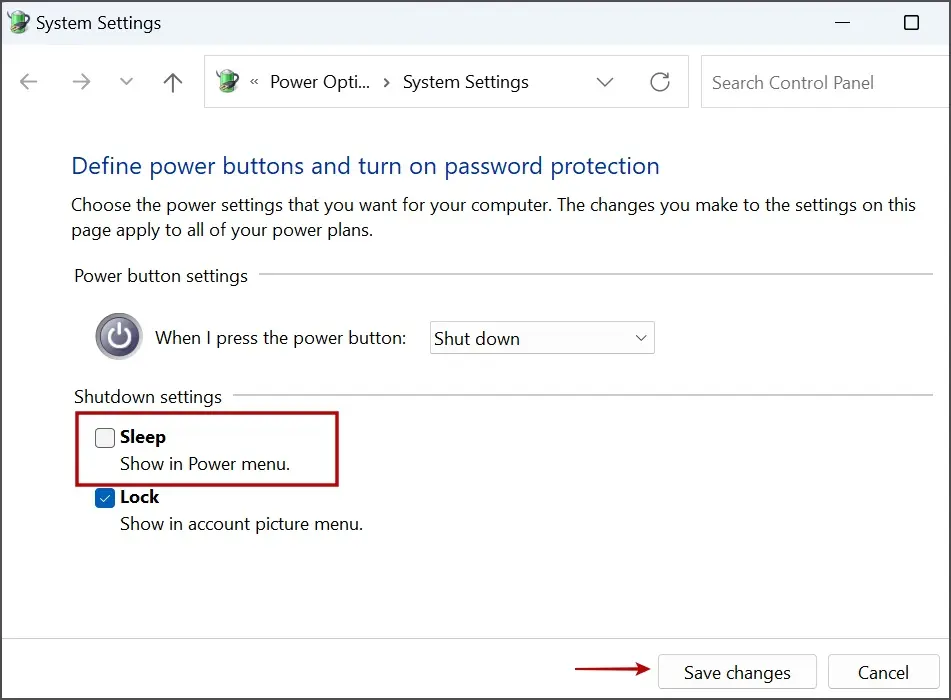 Krok 5: Zrušte zaškrtnutí políčka vedle položky Spánek a klikněte na tlačítko Uložit změny v pravém dolním rohu.
