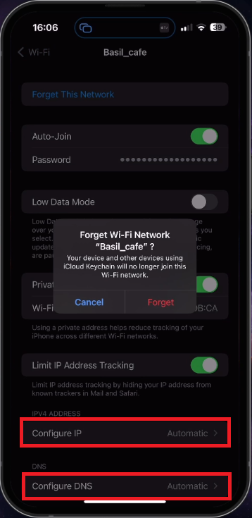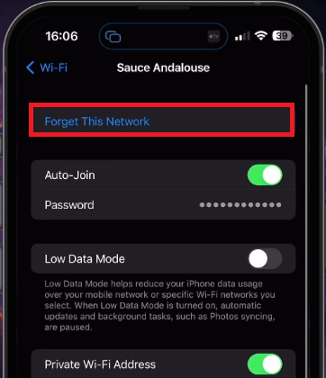 Dále přejděte vzdušnou čarou do aplikace Nastavení iOS pro hlubší analýzu sítě. Přejděte do nastavení WiFi a klepněte na ikonu „i“ vedle sítě WiFi, ke které jste byli dříve připojeni. Zde máte přístup k dalším možnostem a nastavením. Pokud se potýkáte s tvrdohlavou sítí WiFi, která se odmítá objevit na seznamu, bude vaším dalším krokem „Zapomeňte na tuto síť“.