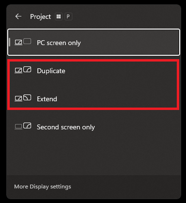 Windows key + Ppro přístup k nastavení projektu.Zobrazí se vyskakovací okno, kde můžete nastavit zobrazení na „duplikovat“ nebo nejlépe „rozšířit“.