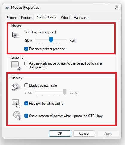 Panel poskytuje další nastavení myši, jako je změnaRychlost ukazatelenebo zobrazováníUkazatelské stezky.