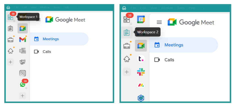- Pracovní prostory Rambox:Tato funkce je ideální pro udržování vaší pracovní plochy uklizené a efektivní. Pokud používáte Google Meet s více profesionálními účty (jako je vaše hlavní přihlašovací jméno společnosti a další, který poskytuje klient nebo partnerská organizace), Rambox vám umožňuje uchovávat je odděleně. Můžete nastavit různé pracovní prostory: jeden pro vaše firemní nástroje (Google Meet, Slack, Teams) a druhý pro aplikace specifické pro klienty. Tímto způsobem vždy přesně víte, kam se u každého projektu nebo spolupráce obrátit.