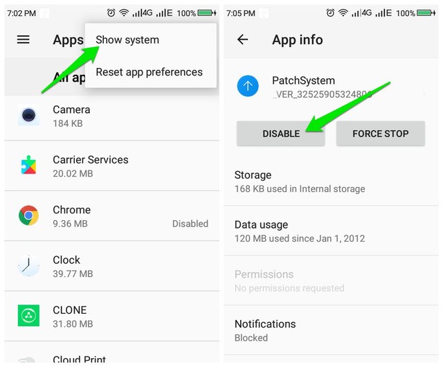 Měl bych také zmínit, že v mém případě se jednalo o aplikaci tzv"Patchsystem", což je systémová aplikace, kterou nelze odinstalovat. Pokud je systémová aplikace příčinou reklam na oznamovací liště také ve vašem telefonu, pak v"Aplikace"klepněte na tlačítko nabídky v pravém horním rohu a klepněte na"Zobrazit systém". Nyní otevřete systémovou aplikaci, která způsobuje problém, a klepněte na"Zakázat"aby to nemohlo fungovat.