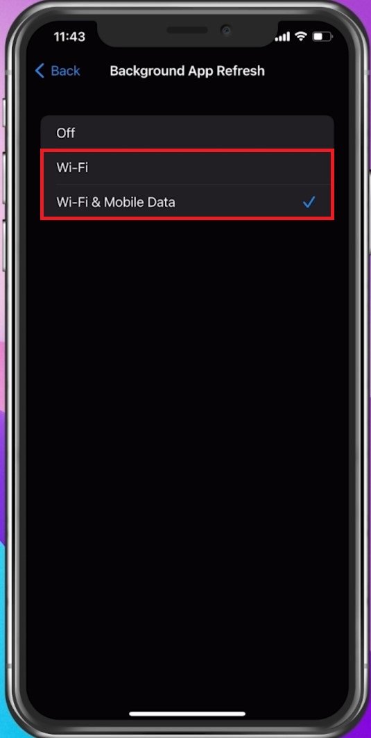 Ve vašemGenerálnastavení, klepněte naAktualizace aplikace na pozadíaAktualizace aplikace na pozadíje při použití připojení Wi-Fi nastavena na Wi-Fi.